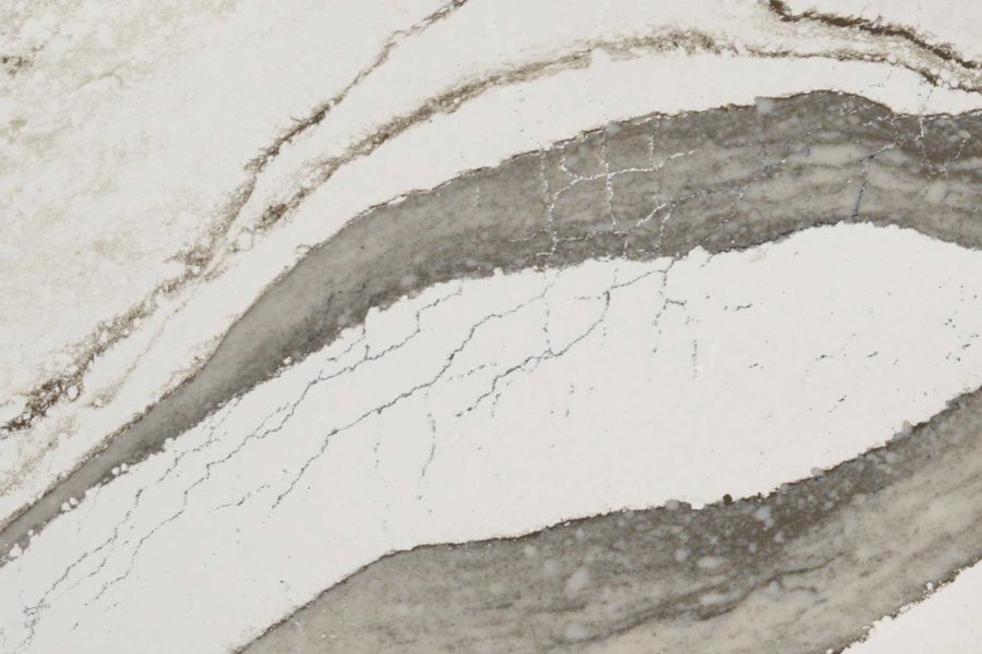Set against a bone-white marbled backdrop, bold translucent olive green veins plunge in various directions with subtle white and black tributaries interspersed throughout.